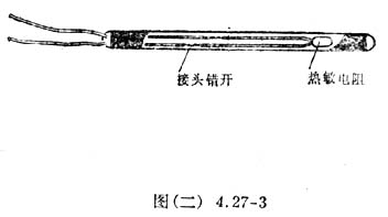(1)取热敏电阻,如型号是RRC6型的小型热敏电阻,按图(二)4.27-3所示的结构,焊上引线,套上一段塑料套管,再把它浸在熔化的石蜡锅里浸蜡封口。