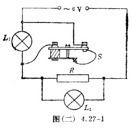 按本节要求利用双金属片传感器控制的电路可如图(二)4.27-1所示。图中L1(红灯)和L2(绿灯)为“6.3V 3A”的小电珠,R是电炉丝(5Ω),S是双金属片,受热时 向下弯曲,低温时两端处于导通状态。