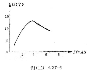 顺便说一下,为什么测量时电桥干路中的电流不能超过一定值,这是由于热敏电阻伏安特性决定的。热敏电阻在同一室温下的伏安特性如图(二)4.27-6所示。为什么当电流I上升到一定值后,它两端的电压U反而下降,这是由于通过热敏电阻的电流过大使它本身发热造成的(自热)。设计热效电阻温度计应避免它进入特性的这一阶段(称为负阻段)。