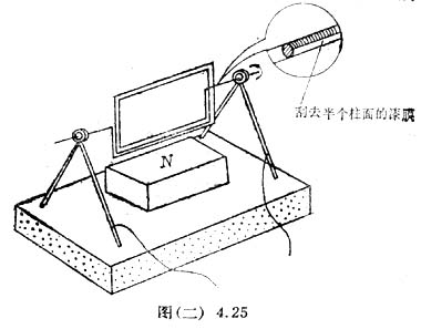 用漆包线绕一个数匝的线圈,把引出线的表面漆刮去,制成线圈的转轴,架在裸铜支架上。通电以后,线圈只能摆动数下就停下来了。这是因为线圈转过中心面以后所受磁场作用的力矩改变了方向,因此不能持续转动下去。如果在转过中性面后,不对线圈通电,则线圈有可能依赖自身的惯性转过半圈。以后再给予通电,线圈就可以再得到加速。如此下去,它就可以转动了。如何实现半周通电的设想呢?只要在每根转轴的特定方位,刮去半个柱面的漆膜;问题也就应刃而解了。具体结构如图(二)4.25所示。