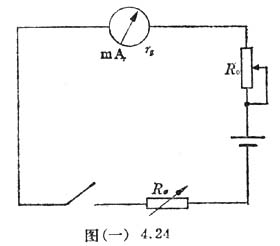 1.按图(一)4.24所示电路接线,以RX作为待测电阻,确定待测电阻为零时毫安表满偏电流Ig对应的R0值。