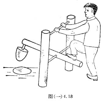 你见过农村小户人家的舂米机吗?这是一种把米冲成米粉的简单机械,如图(一)4.18所示,它是靠人用脚踩使冲头抬高,再自由下落与石臼里的物体撞击做功的。你能否设计一个利用高处流下的水做功的舂米机吗?请按你的方案制作一个小的模型。