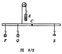 如图8/2安装实验仪器,细线一头挂着钩码,另一头绕过滑轮后固定于小孔,往上拉住尺子,此外在别处用细线把钩码悬挂在尺上,调整钩码的位置使尺水平。记录作用于尺上诸力的作用点及大小,包括通过重心的尺的自重。重复数遍,每次都改变钩码的数值及悬挂位置,使支承钩码作相应的变化。