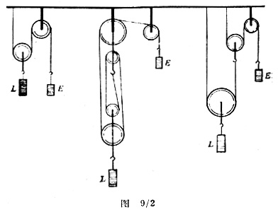 图9/2中有几种滑轮组,安装其中一组,并使吊钩上挂砝码E时滑轮组平衡(滑轮组的负荷为L),记下负荷和砝码的值。在较大的范围内改变负荷并重复进行实验,记下每次的一负荷和相应的砝码的值。再安装另一个不同的滑轮组并重复上述实验。