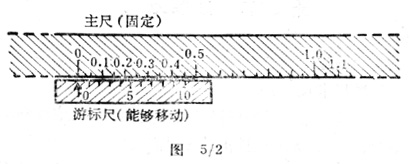假设图5/1中主尺AB上刻有cm和mm刻度,游标尺CD长0.9cm,并被分成十多份,每份长为0.09cm,它能沿着主尺移动。假设第一点A和C重合,如CD向右移动直至E和F重合(即是零后面的第一条刻线),CD就移动了(0.1-0.09)cm,即0.01cm。同样地,当G和H重合时,CD要移动