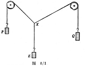 尽量减小滑轮的摩擦力(如往轴间注入润滑剂),并使之在竖直面内转动,在细线的X处有一滑动的绳结(小绳圈)。分别在吊钩P、Q和E处挂上适当的砝码,当整个系统达到平衡时,立即用虚线在细线的正后方标出细线的方向。为了消除视差,可以在悬挂P(或Q)的细线后面放一平面镜。