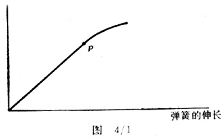 图4/1表示弹簧的伸长如何随负荷变化。因为实验者可以任意改变负荷,所以取负荷为自变量,弹簧的伸长就是因变量。不难看出:直到P点,弹簧的伸长与负荷的增加是成正比的;在P点以后,增加一个较小的负荷会产生一个较大的伸长。