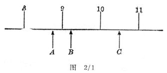 很多情况下我们通过观察仪器标尺上的读数来进行测量。标尺上有适当单位的刻度,读数时总是要判断某个给定的点在标尺上更靠近哪条刻度线。按照测量仪器的读数规则,测量仪器的误差出现在哪一位,读数时就应读到这一位。如图2/1所示,A点记为8.7,B点记为9.3,C点记为10.5,这是因为“. 7”、“.3”、“.5”这一位是我们“估计”出来的,有误差。