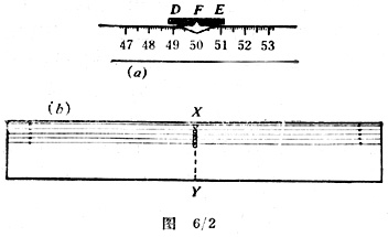 一根1m×100mm×10mm的光滑木条,用平衡法找出它的重心,通过其重心在木条上仔细地作一条直线(图6/2中的xy),接着如图所示钻五个间隔均匀的孔,往每个孔内紧紧地插入一段短玻璃管,玻璃管的内径刚好允许刀口自由通过,然后作一组平行木条边缘的直线,这些直线与所钻的孔的边缘相切,在每条线上都钻上小孔,这些小孔距木条的距离都相等,(小孔应尽量靠近末端点),这些孔用于悬挂天平盘。
