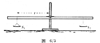 如图6/3所示,使安装了金属支承(DE)的米尺平衡,如果它不能水平,就在翘起的一端绕上合适的细漆包线来校正。接着将天平盘S1和S2
