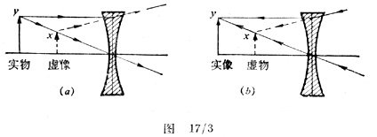 在研究虚像时,u和v的值仍可互换,但这时必须改变符号。图17/3(a)表示一个物体和它在x处的虚像。如果光线箭头相反,则我们会得到图17/3(b),在图17/3(b)中朝着x汇集的光线被透镜发散得到一个在y处的实像,光线并非真实地从点x发出,而是认为有一个虚物在x处。根据这点可以认为一个真实物体和它的虚像能“共轭”于一个虚物和其实像。像前面所说的那样,把u,v互换时必须考虑符号。类似的讨论能用于所有的虚像,不管它们是由透镜或面镜会聚而成还是发散而成。考虑到所有可能的情况,可以作出一套完整的图形。建议读者进行这方面的练习。这类练习的全部结果都可以概括到图17/4所示的图象中。可以看出,在第一象限里的点,它们的共轭点也在第一象限内,在第四象限内的点的共轭点则在第二象限内,在第三象限内的点的共轭点也在第三象限内。