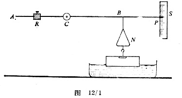 如图12/1所示。AB是夹在C上的细钢线,C固定于水平轴的支承上,这水平轴与纸面垂直,它由三脚支架支承(图中未画出)。水平轴可通过一只螺旋调节高度。R是游码,N是秤盘,P是指针,S是标尺。