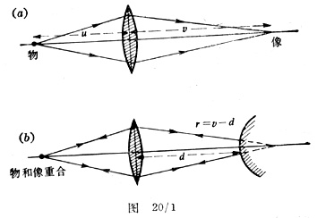 安装装置,在一个屏上获得发光体的清晰的像,找出像到透镜光心的距离v,使v比面镜的曲率半径,更大一些。保持物体和透镜的位置不变,在像和透镜之间插入凸面镜并移动其位置,使像与物重合,该像是由凸面镜反射光线通过透镜折射形成的。如图20/1(b)所示,测量面镜顶点和透镜中心之间的距离d。按不同的位置,重新排列透镜和物体,重复本实验。