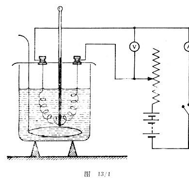 把电热丝接入如图13/1所示的线路中,合上开关,调节变阻器使合适的电流通过电热丝,要求两块电表偏转时指针接近满刻度;这个调节过程完成后迅速地断开电源开关进行搅拌,搅拌均匀后记录水的温度。然后,重新接通电流并启动停表,注意观察电压和电流的值,如果有变化,应当及时调整可变电阻使电流恢复到原来的大小(如果其中的任一个有显著改变则需重做实验)。通过电流时要缓缓地搅拌水。