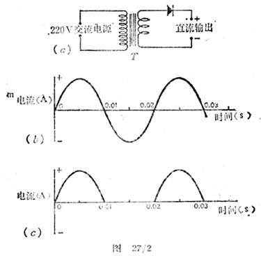 在图27/2中表示出半波整流器的作用。图(a)表示出整流元件是怎样接入电路的,T是变压器,它把电压降低到整流器的工作电压,图(b)是 T的初级电流时间曲线,其上半部分表示的电流与下半部分表示的电流方向相反。图(C)表示流过连在输出端的线路元件上的电流曲线。这里已假定电流的正方向为整流器的正向,这样的整流叫半波整流。