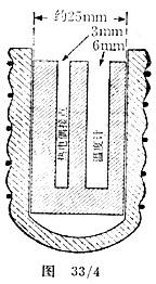 在一段长50mm直径为25mm的黄铜棒上(如图33/4所示)钻两个孔,一个直径为3mm,另一个为6mm(一个孔放热电偶接点,另一个孔放温度计),钻第二个孔之前,要设法保证这个直径为6mm的孔能放入所使用的0-360℃的温度计。把它们与黄铜棒一起装进一只600W的槽形电热器的加热元件里(如图33/4< /SPAN>所示),黄铜棒和加热器线圈不能接触,两只孔中较小的一个内放热电偶接点。用软木塞把另一个热电偶结点固定在一支试管里(作为冷结点),0-100℃温度计穿过软木塞放入试管内。