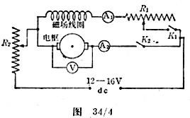 按图34/4安装电路。其中A1和A2是安培计,后者的量程为0-5A,R1和R2是变阻器,K1和K2是插塞开关,V是伏特计。