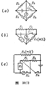 电阻箱式电桥是一个惠斯登网络,如图30/2(a)。这网络是由四只电阻闭合地串连在一起成“菱形”或“风筝”状。跨过“菱形”的对角线分别连着电池组和检流计,其上各附一只旋塞开关。