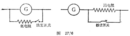 检流计常在置零法中作为指零仪器使用,可以按图27/6所示的两种方法之一保护检流计。