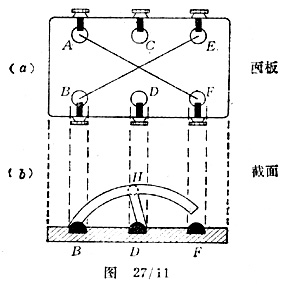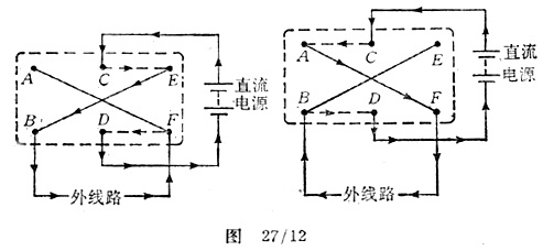 一种使电流反向的装置称为波耳换向器,它如图27/11(a)和(b)所示。其中A、B、C、D、E和F是装在底板的接线柱上的水银槽,AF和BE铜条连接。两个铜制弧状 桥[竖着看其截面如图27/11(b)所示],一个的中心支点在C处,而另一个在D处。它们用绝缘棒H连接,在面板上看不到它们。换向开关是线路的一部分,线路 中需要换向的部分接到B和F上,电源接到C和D上(见图27/12),把铜制弧状桥从一个位置转到另一个位置时电流就可以倒转方向。为了保证当弧状桥换位置时线 路的电阻不变,要求钢条AF和BE的电阻相等。如果外电路接在A和B端,则反向时电阻的变化等于AF和BE电阻之和。