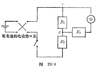 注释:检流计的内阻确定后,能直接得到它的灵敏度。当K2断开时,先用已取得的观测数据估计检流计满刻度偏转所需电流值。这时可以用图29/4所示的线路,其中R3等于检流计 的内阻与100Ω之差。(这里假定检流计的内阻小于100Ω。否则所差的值必须设法除去)为了使G获得满刻度偏转,由于电位差计的原因G应跨接在x和y之间。如果 x和y之间电阻为R,因为R2和R构成一个分压器,这时能计算出R2/R的值。