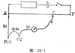 组装电势差计电路,按将测5mV电压设计电路。把热电偶的一个接点浸入温度可以改变的水槽中,并且连接到电势差计电阻线的正端(即X端),把热电偶的另一个接点渗入熔解的冰槽中,并把该接点通过检流计连到滑动触头Z上,如图33/1所示。把温度计插入每只槽中。