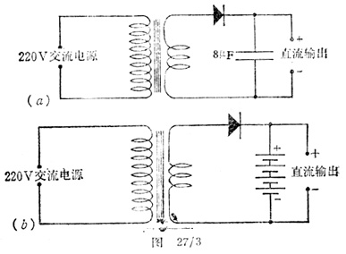 整流后输出的是脉冲的或变化的电流,这在有的演示实验中无关紧要,但对于某些作定量研究的实验则不行。将这种形式的输出电流变成平滑的电流称为滤波。当需要几毫安的电流时可以像图27/3(a)那样,在线络的输出端并联一只8μF的电容器。而要获得大电流时可以参考图27/3(b),用蓄电池组代替8μF电容。这时电池的正极必须接到输出端的正极,否则会严重地损坏电池。所用蓄电池组的电动势要小于整流器输出电压峰值的1/3,其原因如下: