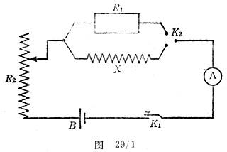 释放K1,转动K2使R1接入线路,把R1调到最大值后按下K1,调节R1直到电流与前面的值相同,记下相应的R1之值。用不同电流值再做1—2次,给出相应电流值时的R1之值,这就是X的电阻值。