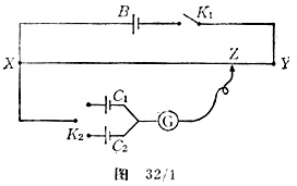 按图32/1安装电路,其中XY是电势差计电阻线,Z是滑动触头,B是蓄电池,K1是插塞开关,K2是双路开关,C1是丹聂尔电池,C2是勒克朗谢电池,G是检流计。