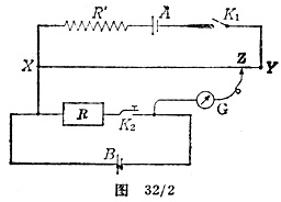 按图32/2安装电路,其中XY为电势差计的电阻线,Z是滑动触头,A是蓄电池,K1是按键开关,B是待测内阻的电池或电池组,R′是用来保证“开路”的平衡点接近Y处的串联电阻,R是电阻箱,K2是旋塞开关,G是具有灵敏度控制装置的检流计。