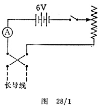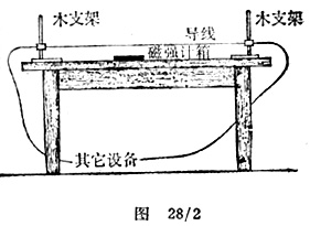 按图28/1接好电路,使用一根长直导线,其长度不少于2m。为了使杂散磁场降至可以忽略的程度,别的设备应尽量远离磁强计。譬如,把磁强计放在桌子中间,导线穿过木支架并固定于其上,别的仪器则安装在地板上,如图28/2所示。