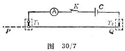 下一步是把电阻丝接入图30/7所示的电路。其中T1和T2是夹在实验台上的接线柱板,电阻丝接在T1、T2的接线柱之间,A是毫安表,C是干电池,K是旋塞开关。