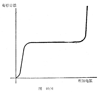 G-M管的特性如图40/6所示。如果它在低于额定电压下工作,就没有用上整个阳极的长度,这时它工作于“正比区间”,即其灵敏度取决于所加的电压。当所加电压低于某个值时(称这个值为“起动电压”),管子根本没有反应。在工作电压大于额定电压时,整个阳极都在起作用,这时它的灵敏度几乎和所加电压无关,这就是曲线的平 稳段,称为“盖革区间”或坪区。在研究G-M管的这些特性时,常把100mmHg左右的氩和酒精混在一起充入G-M管中作猝熄剂,也可以用100mmHg的氖和一种卤族元 素(氯或溴)作猝熄剂,使得它的局部压强为0.1mmHg。当探测β粒子时,G-M管的效率接近100%;但是用它探测γ射线时,就下降到1%左右。因此,它用于探 测γ射线时所显示的结果比真实情况弱得多。