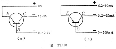 另外,用电阻测量仪表(万用表)检测晶体管时,红色表笔或插孔与表内电池的负极相接,因此任何需要正极电源的晶体管电极必须与电阻测量仪器(万用表)的黑表笔相接。晶体管的常规的极性线路如图39/6所示。图39/10(a)给出通常所用电压的理想值,图39/10(b)则是电流的理想值。这些值比热阴极电子管所需要的小得多。