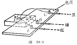 如果在螺栓上装上一块焊片,把电路引线事先焊在焊片上,把晶体管管脚夹在螺栓上两个螺帽之间,就能减少损坏的危险。三个这样的螺栓螺帽装置必须安装在一块胶木条上,并留有适当的间距,使得能方便地区别发射极,基极和集电极,这样就减少了造成错接极性的危险。胶木条应固定在如图39/9所示的黄铜块上。最后,在胶木条上用适当的字母标明焊片,并且在集电极上加上色点,电路的引线也要按所示涂上颜色(或者套上彩色套管)。必须特别强调,由于电极接错在使用时将导致晶体管烧毁。