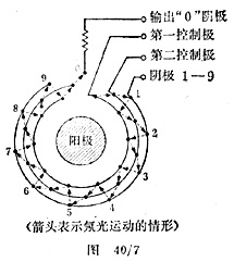 所有的第一控制极连接在一起,所有的第二控制极也连接在一起,如图40/7所示。管内充以氖气,氖气在有适当电势梯度的区间发出其特有的辉光。有计数脉冲时,辉光放电保持在阴极上;从“0”到“9”的数目字被安装在跟这些阴极相对的位置。