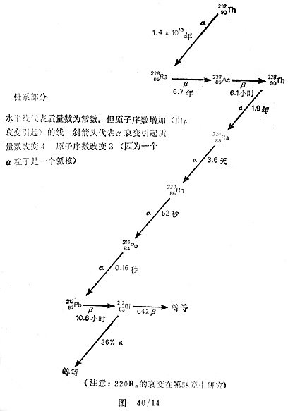 称为钍,它们都产生于元素钍(原子序数90)开始的一系列放射性衰变之中。部分钍元素衰变如图40/14所示。从中能看出,以水平箭头代表β衰变过程,伴随着发生的是原子序数的升高,但质量数不变。在箭头的一边给出了衰变的半衰期。