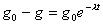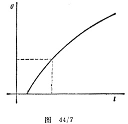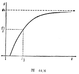 氡220(即220Rn)经历α衰变,而α粒子将电离室内的空气电离。α粒子的数量是氡220剩余量的一个量度,因此石英丝影像的运动速度也是氡220剩余量的一个量度。如果用“g”做分度镜读数,用“t”时间读数,则g-t曲线如图44/6所示。从其中可以看到,曲线以直线g=g0为渐近线。如果观测数据能保证确定g0,则半衰期就能从曲线上找到。但是,如果在到渐近区域之前观测数据就使曲线停止弯曲,如图44/7所示,就必须按下述方法确定g0: