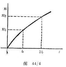 但是,如果曲线如图44/4所示,即在远离渐近线的一段上就中止,则可按下面的方法:在曲线上选择坐标为(t1,n1)的一点,和坐标为(2t< SUB>1,n2)的另一点,将这些坐标值代入方程(1),得到