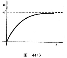 在本实验中,脉冲率低得几乎无法测量,但能观测信号发生器的每次摆动时间。一般说来,第一次脉冲在启动之后10s左右,而第二次约在此后15s,依此类推。为了确保能由这样一些观测值求得半衰期,要绘出以脉冲次数n为纵坐标,t为横坐标的曲线,它将如图44/3所示,曲线给出的关系是