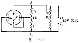 按图38/3安装电路,其中P1和P2是分压器,X1、X2、Y1和Y2是偏转极板,T1和T SPAN>2是80V交流电源的接线柱。