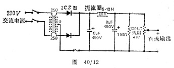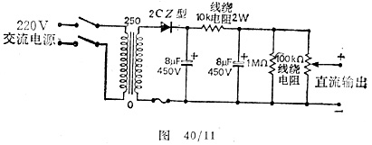 制作几毫安,0-250V的交流半波整流器,可以采用2CZ52E型硅整流二极管;变压器的次级线圈可以没有中心抽头,也可以使用250-0-250V变压器的一半;元件和电路如图40/11所示,两只电容和它们之间的10kΩ线绕电阻构成π型滤波器;加在输出端的1MΩ电阻为旁漏电阻,当切断电源时,电容将通过它放电。图40/