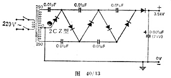 在图40/13所示电路中,元件被安排在一块100mm×200mm的胶木板上,胶木板使元件与地绝缘。采用2CZ52E整流管;电容器的直流工作电压为3< /SPAN>-5kV,这可以确保它不被击穿。还应注意,0.01μF的储能电容需承受全部的电压,应当采用耐压7kV的“电视电容”。