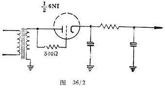 常用的国产整流管有小型管6Z4和八脚管5Z3P,6Z5P。6Z4的整流电流为75mA,5Z3P的为230mA。6Z5P的为70mA,如果所需电流较小(如在20mA以下),可以用6N1的一个三极部 分作半波整流,如图36/2所示电路,其中阳极(板极)、栅极间所接电阻是为了防止损坏栅极,要求不小于500Ω。但用的最多的是如图36/1所示的电路,电子管通常为6Z4和5Z3P等。