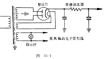 电子管整流电路如图36/1所示,由变压器的次级绕组350-0-350供给交流电压,输出电流为80-100mA。一般而言,旁热式灯丝电压为6.3V,直热式的为5V,具体使用时要查阅有关资料。