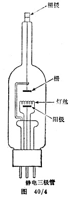 用脉冲静电计能测定10-9A或更小的电离电流。在研究如此微弱的电流时,需要用到直流放大器,它由一只“静电三极电子管”构成。这种管子的设计如图40/4所示,它的栅极电路阻值很高,栅极电流很小──它 们的数量级分别为1017Ω和10-10A。因此,这种管子用在输入阻抗极高的情况。但它的放大倍数很低、甚至会小于1。它的外壳是由高度防漏电和防大气污染的特种玻璃制成。为了增加泄漏电流通道,管子顶部被加长,栅极就置于管子的这一端。应当注意的是,不要触摸管子,如有必要可以 使用钳子。电子管中所用的是低电流灯丝,以减少正离子发射。把栅极这样放置可以使到达阳极的正离子减少到极少。通常把电子管放在一只不透明的罩子里,以减少光辐射。