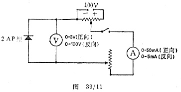 (i)正方向:按图39/11连接电路,使二极管处于正向,把电压调到较低的值,与电流表串联的变阻器调到最大值。接通电路,并记下二极管两端的电压和通过它的电流。逐次增加电压(改变变阻器阻值,使电压每次增加0.1V),电流也会随之增加,记下新的电压和电流值,连续测取数据直到电流达到50mA左右为止。