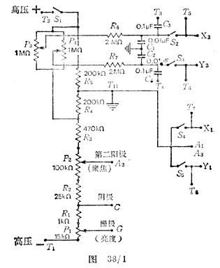 从控制栅出来的电子束穿过第一、二、三阳极,这三个阳极对于阴极都处于正电位。这些电极之间的电场,随所加的电势不同,可以使电子束汇聚或发散。它们的作用类似光学中的透镜组。通常使第一、三阳极相对于阴极处于最高电位,第二阳极则处于较前两个低些的电位,但比阴极电位高。第二阳极的电位可以改变。用这样的方法,能将光点聚焦在屏上。控制第二阳极电势的分压器起着“聚焦”作用,见图38/1。屏面涂着一层硅化锌,当电子轰击屏时,它会发出绿光。