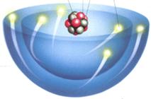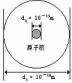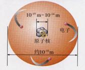 2、趣味计算:我们已经知道原子的质量主要集中在原子核上,原子核的半径约为原子半径的 1/100000,一个质子(或中子)的质量约为 1.67×10-27 kg。假设右图为氢原子构成示意图,若 1 cm3 (=10-6 m3)的容器内装入的全部是氢原子核,粗略计算一下其质量约为多少?假若“国贸大夏”(体积按30000m3计算)内装入的全部是氢原子核,质量又是多少?和月球的质量(约 7.35×1022 kg)相比较,哪个大?你听说过“中子星”和“黑洞”吗?查一查资料,你对原子又有了哪些新的认识。(V球= 4/3πr3)