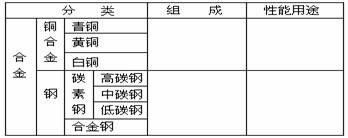 课 题 3—3用途广泛的金属材料 课标要求 能列举出合金材料的重要应用 教学目标 1、知识与技能 了解常见合金如铜合金和钢材料的重要应用 了解金属材料的分类,认识合金材料的组成、性质与用途的关系 2、过程与方法 通过对金属材料在日常生活中的应用的讲座、交流、培养学生自主学习和合作学习的意识,学会获取信息及对信息进行加工。 通过自选某种合金作为课题进行课外实验活动,体验科学探究过程。 3、情感态度价值观 通过了解金属材料的广泛使用对日常生活乃至人类社会的发展所起重要作用,激发学生学习化学积极性。 通过对金属材料的用途方面的讨论与交流活动,培养学生辩证唯物主义的观点及对与化学有关的社会和生活问题做出合理的判断能力。 学生分析 对金属材料及合金已有初步了解 重点难点 金属材料的特性及常见合金的组成与性质 教学准备 阅读材料 教学过程 教 学 活 动 设计意图 〖引言〗金属材料的出现和使用对人类社会文明的发展起到了巨大的推动作用,从5000年前使用青铜器,3000年前进入铁器时代,到20世纪铝合金的广泛应用,金属材料在生活、生产、科技、国防各领域发挥着日益重要的作用。 〖提问〗在人类社会发展的漫长历史中,历史学家按当时使用的有代表性的材料将人类社会划分哪几个时代?(石器、青铜器、铁器时代) 当今广泛应用的“三大材料”指的是什么? (陶瓷材料、金属材料、合成高分子了材料。) 〖交流讨论〗列举金属材料在工农业生产、国防科技及日常生活中的应用,并说明金属材料具有哪些性质使其成为其他材料不可替代的重要材料之一? (金属的光泽、良好的延展性、导热导电性、高强度、优良的韧性、可铸造锻压。) 一、常见合金的重要应用 〖学与问〗 1、什么是合金?你知道在生产、生活中有哪些用途吗?举出一些例子。 2、为什么我们使用的金属材料主要是合金,而不是纯金属? (合金具有许多优良的物理、化学或机械性能,在许多方面不同于各成分金属。) 【合金】:是一种金属跟其他一种或几种金属(或非金属)一起熔合而成的具有金属特性的物质。一般合金的硬度>它的组成份,熔点<各组份。 〖阅读思考〗阅读教材常见合金部分,完成下列表格。 感受材料在社会发展中的地位 回忆初中所学内容,直至承上启下作用。
